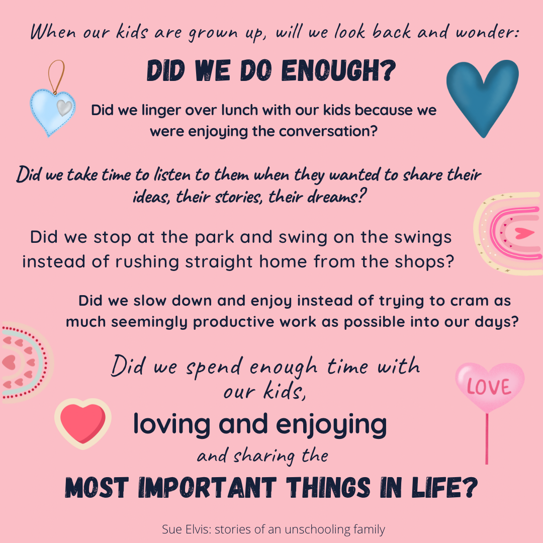 When all my children have left home, I don’t want to look back and wonder, “Did we do enough?” Did I spend enough time with my kids, loving and enjoying and sharing the most important things in life?…’