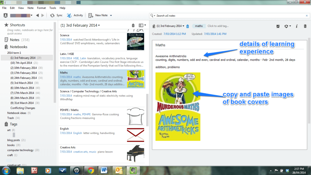 I can record details of each learning experience within each note. I can copy and paste images of books read, or DVDs watched, or games played.