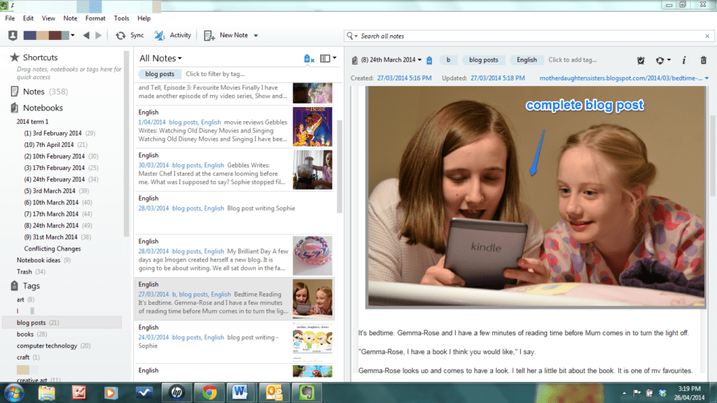 I can import whole articles from either the Internet or my own computer files, into a note. This is a screenshot of a note containing a blog post Sophie wrote. I clipped it directly from her blog. We have imported articles written by other people too.