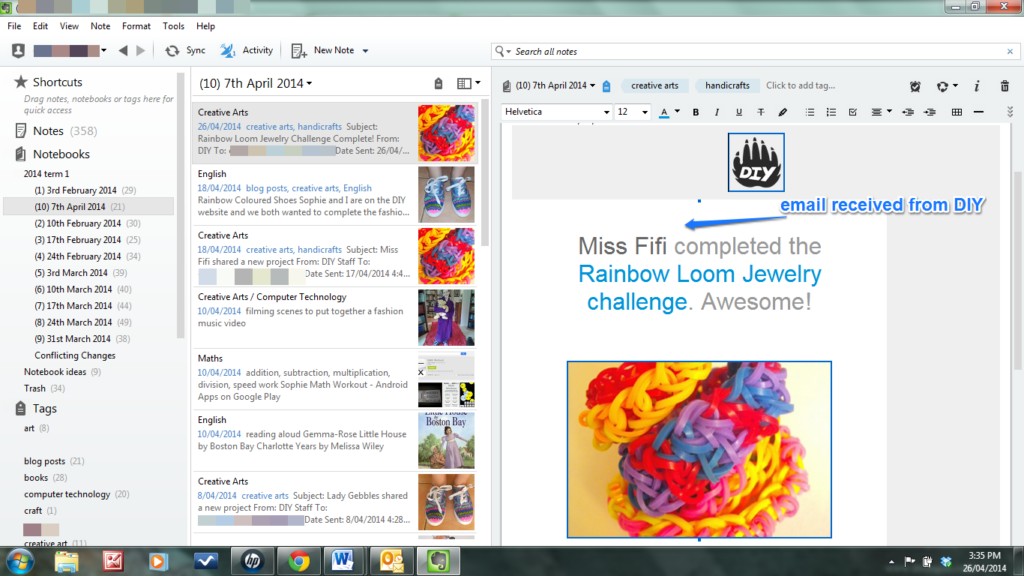 I can import emails into a note. This email is from DIY, telling Sophie she completed the Rainbow Loom jewellery challenge. I have also imported screenshots of her projects directly from the DIY site.
