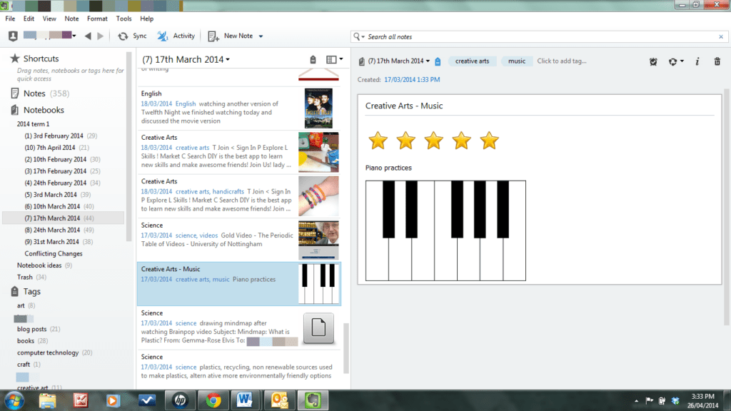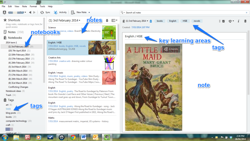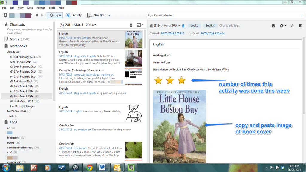 I can reorganise my notes easily by using the tags. For example, I can see all the books we've read by clicking onto the tag 'books'. I can organise all my notes according to a particular key learning area such as English by using the tag 'English'.