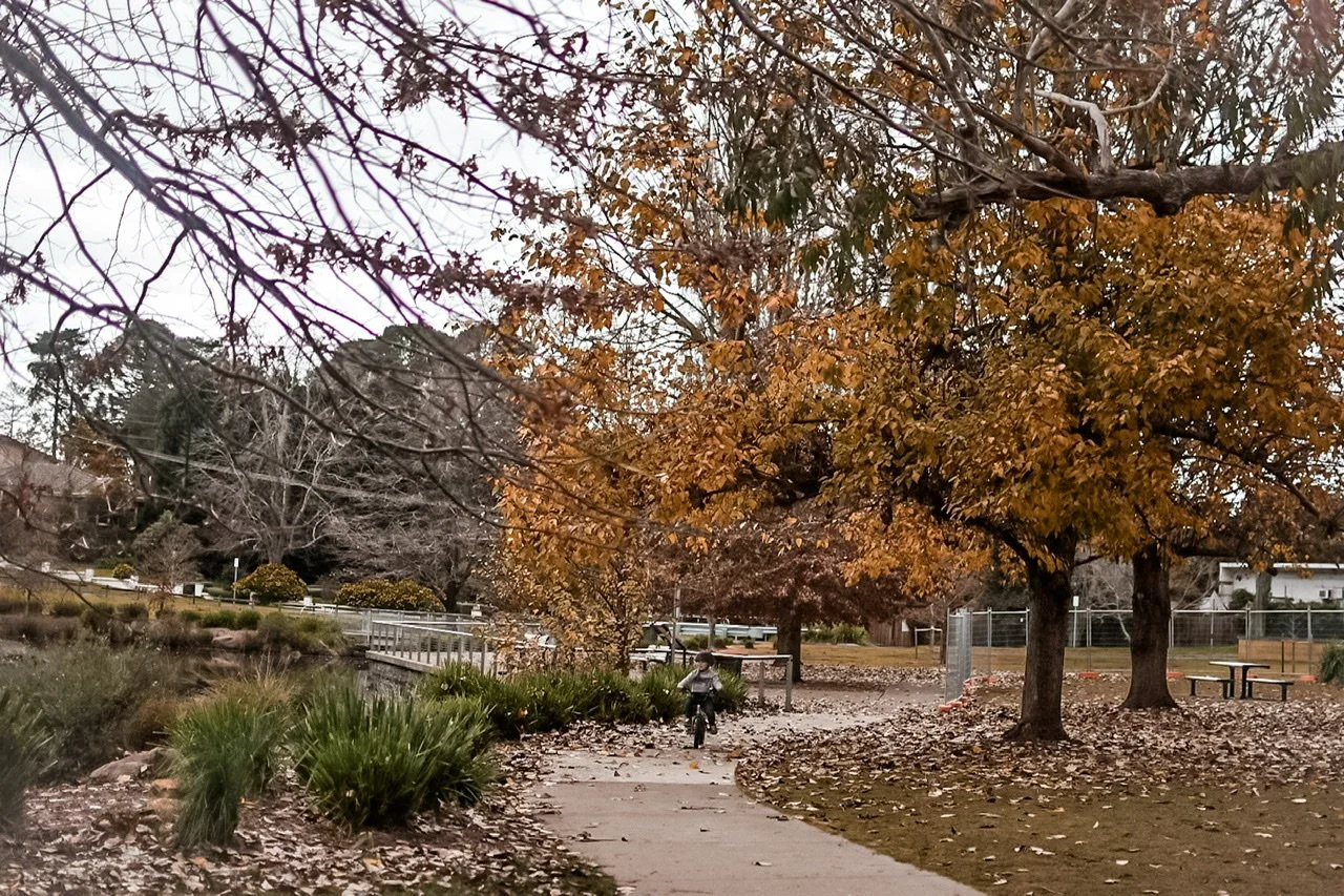 By the time our cups were empty, the rain had ceased. “Shall we try again?” I asked and soon we were marching back along the path. The sky was black and threatening, and the air blew cold upon our faces and hands. As we crossed the bridge, we noticed water rushing and tumbling into a waterfall as it flowed out of the lake and disappeared into the bush. We followed the sound of the splashing water through the trees and found ourselves on the edge of the creek. There was a beautiful fresh earthy smell rising from the leaf-covered soil. The girls and I looked longingly down the enticing track, which leads away from the lake and into the bush.