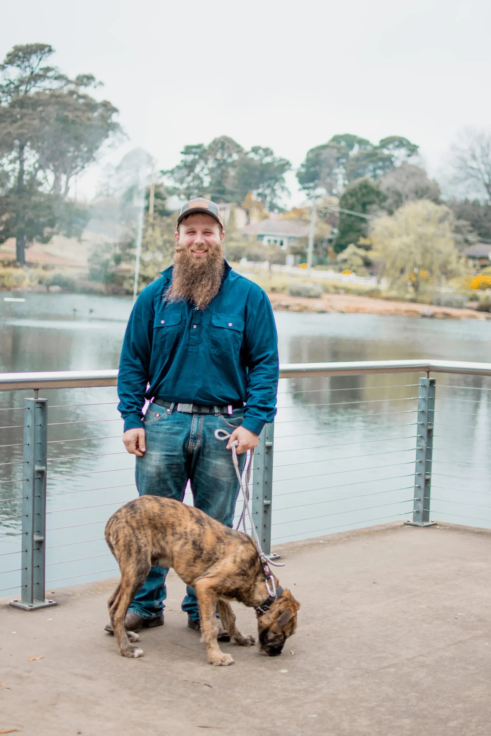 Callum’s 5-month-old puppy, Crash, is a Great Dane/Stag Hound/Staffy cross. He has a striking coat, huge oversized paws that he’ll grow into, and a beard.