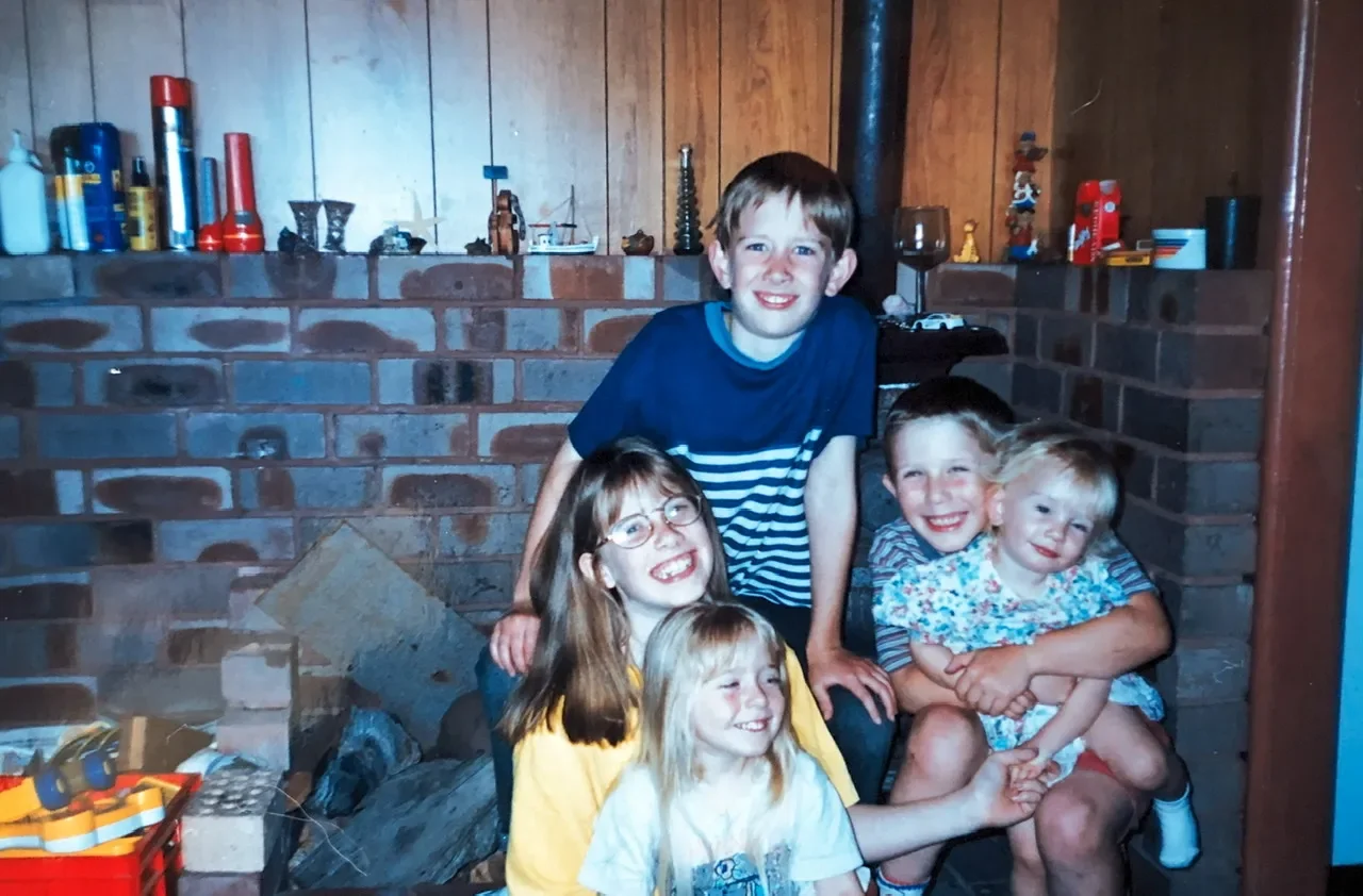 Felicity, Imogen, Duncan, Callum and Charlotte gathered around the wood stove inside the cottage