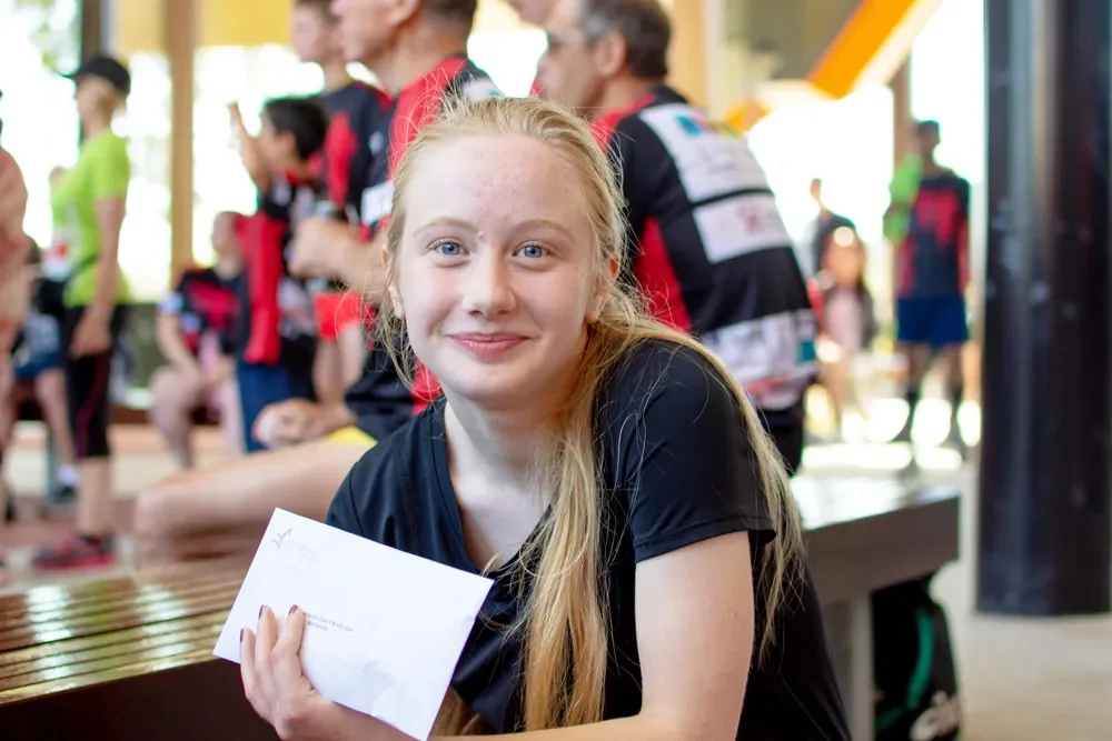 Last Sunday, my daughters Sophie and Gemma-Rose competed in a 10 K run. In this photo, Gemma-Rose is holding an envelope containing a 6 months subscription to a gym. She won it in the post-race prize draw! Gemma-Rose gave the gym subscription to my husband Andy. He’ll be able to use it each day after work.