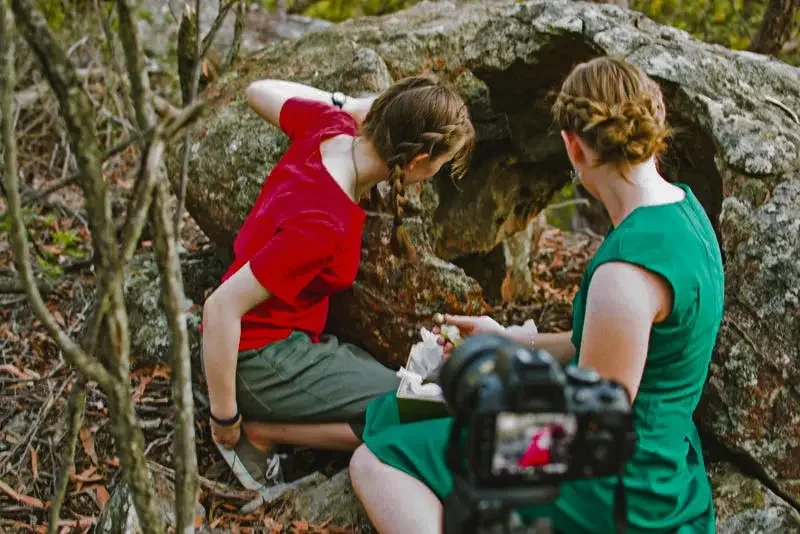 Imogen sits on a rock next to the cave. She places the box on her lap. We point our cameras towards her. And then Sophie begins the countdown: