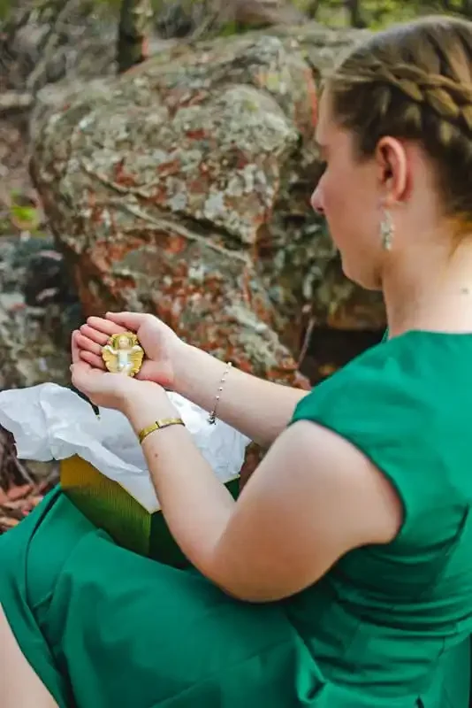 Imogen reaches into the box and takes out a number of figures, one at a time. She arranges them on a large rock. Baby Jesus completes the nativity scene.
