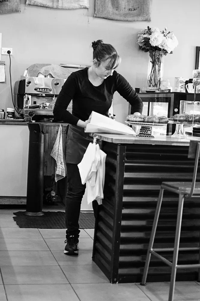 Sophie is sliding some Polish donuts into a paper bag. I’d just bought a few for our morning tea!