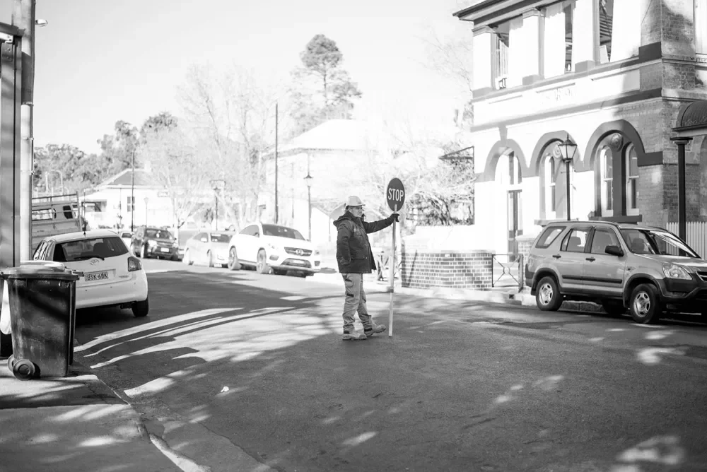One of the workmen (who likes Polish donuts!) is stopping the traffic while a truck enters the building site.