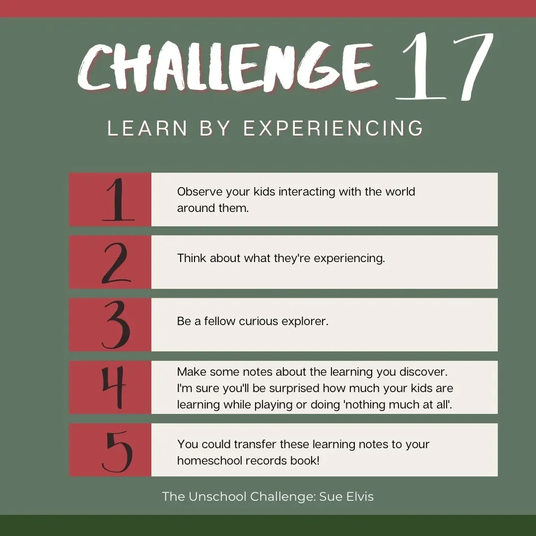 Do Challenge 17: Learn by Experiencing. I’m sure you’ll be surprised by how much your kids are learning while playing or doing nothing much at all!