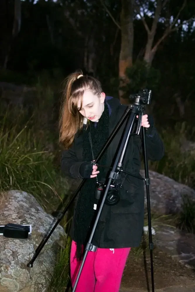 We use two Nikon DSLR cameras: a D3100 and a D7200. Sophie sets the cameras on their tripods. She films each ‘take’ from different angles – full face, three-quarters, side on – making sure we have full body, half torso, and close up shots. She uses a 35mm, a 50mm, and a wide angled lens. We end up with lots of clips and, therefore, lots of possibilities when it comes to putting the video together.