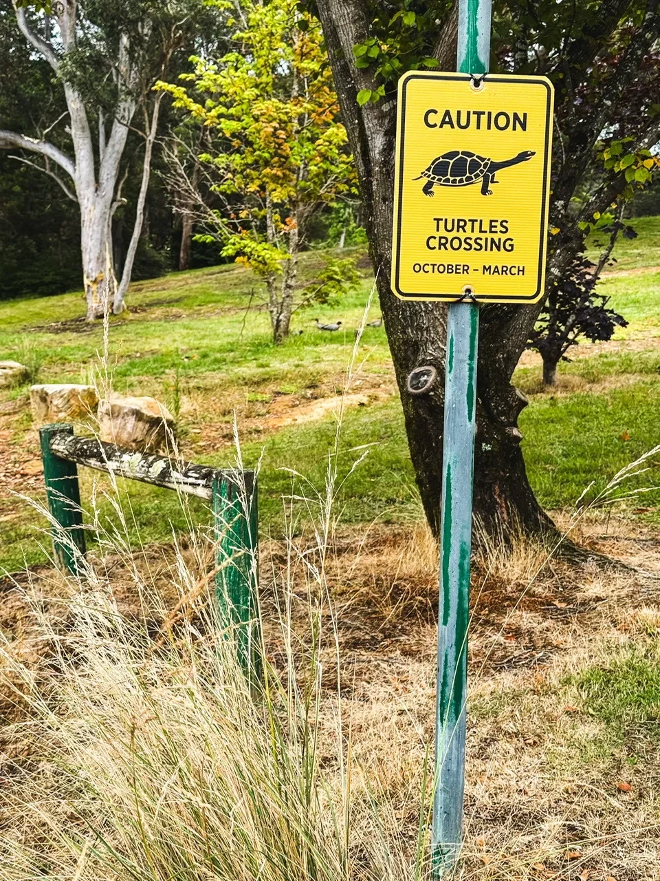 Around the corner from the duck sign is a solar-powered board with the words: Watch out, Koalas about!