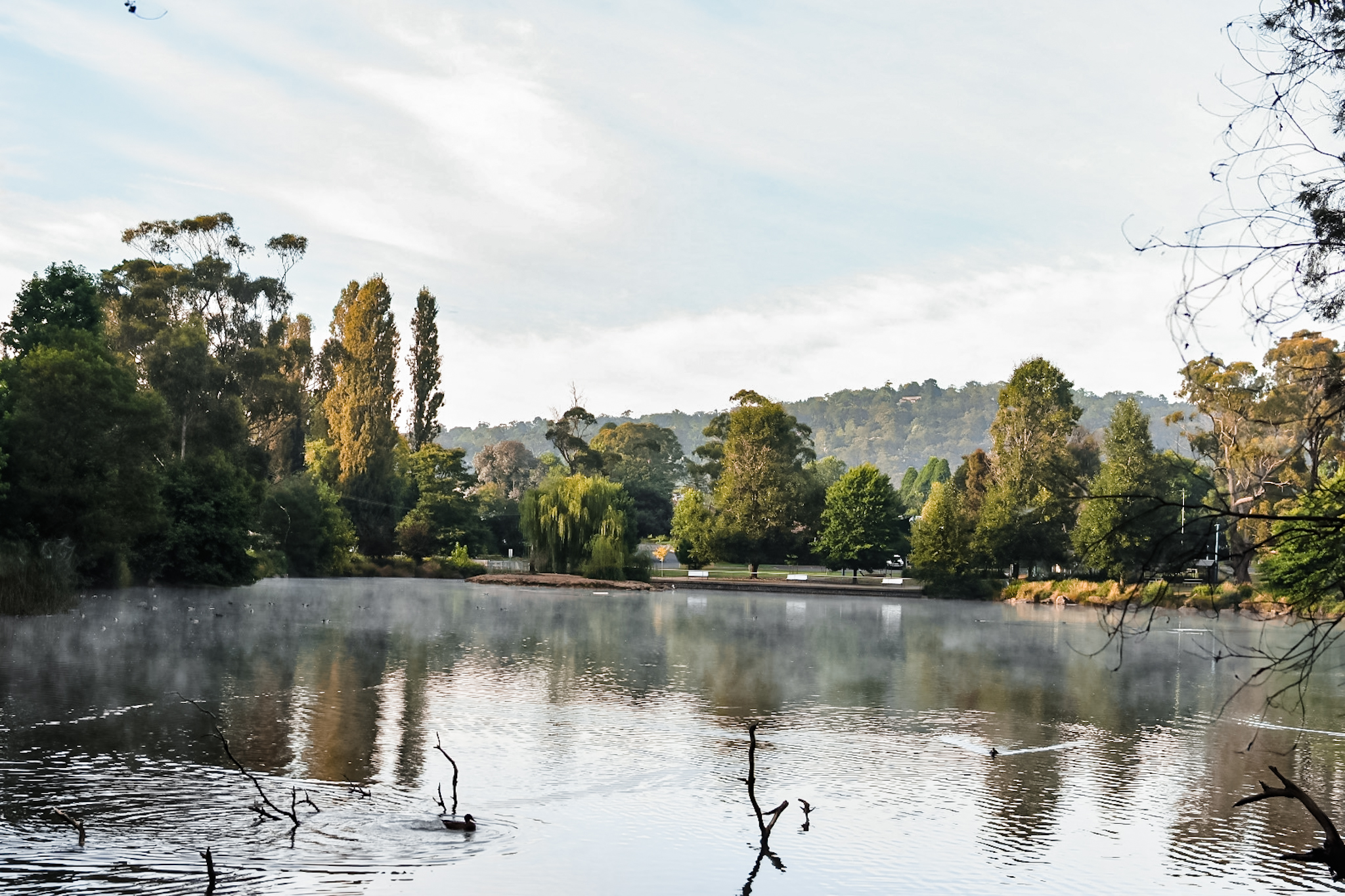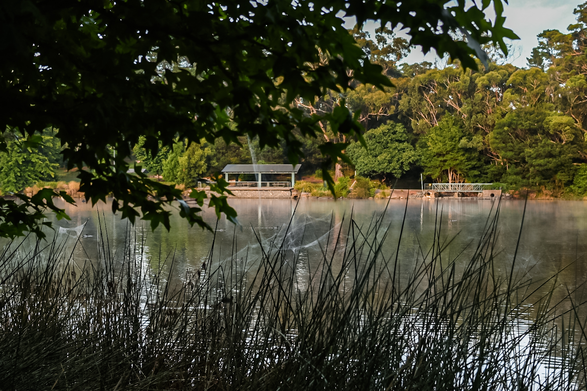 I took these photos while I was at the lake. If you look closely, in the first photo, you might see the mist rising off the water. Can you see the spiders’ webs in the second one?