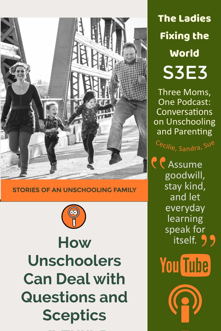 In S3E3 of The Ladies Fixing the World podcast, How Unschoolers Can Deal with Questions and Sceptics, Cecilie Conrad, Sandra Dodd, and I shared stories and strategies for times when people ask us about unschooling: What is unschooling? Why do you do it? Surely unschooling isn’t a sensible idea?