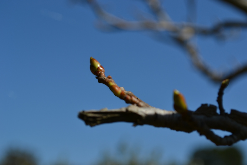 I look up into a bare branched tree and I notice tiny blossoms just emerging from buds.