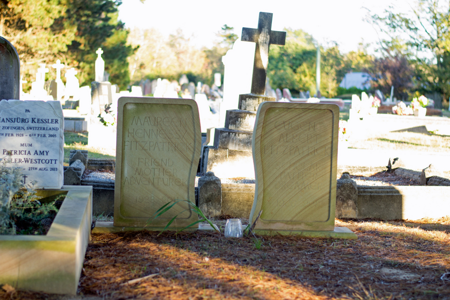 Two people in the cemetery didn’t die or pass away. They’re not resting in peace. But they’re not alive because they have matching modern pale standstone slabs. On each one: a name, a date and three words.