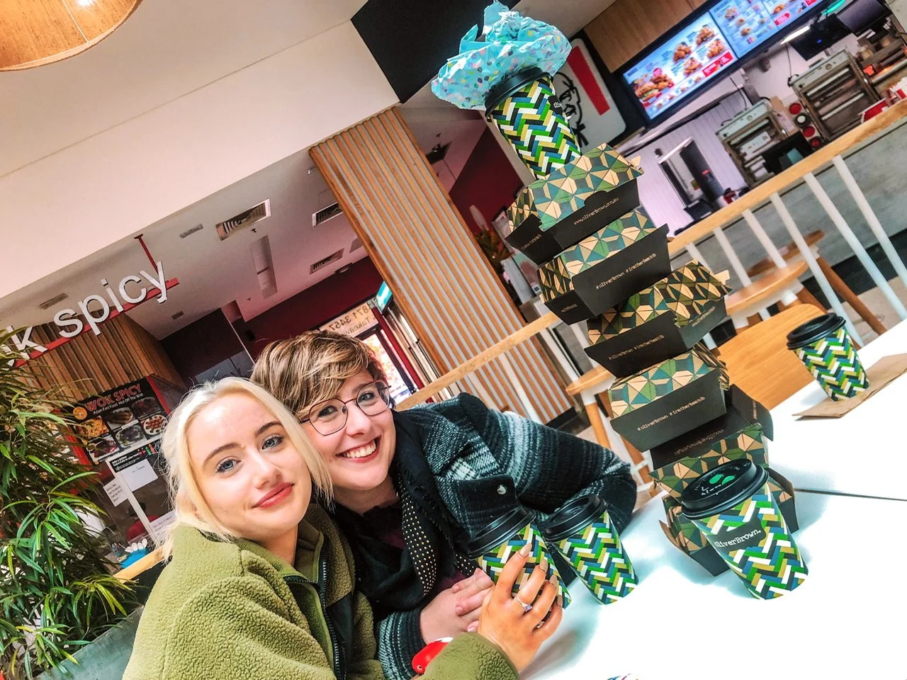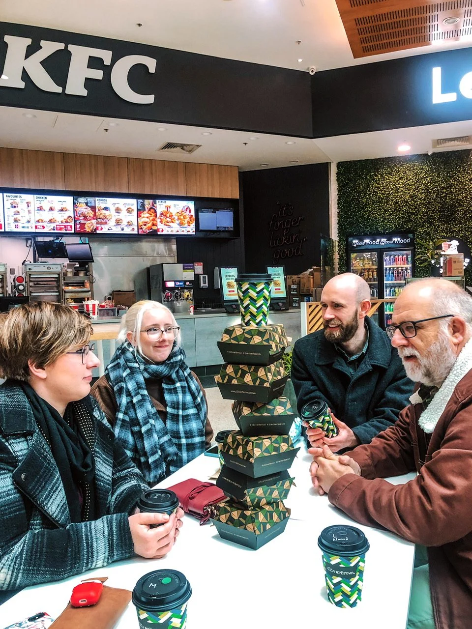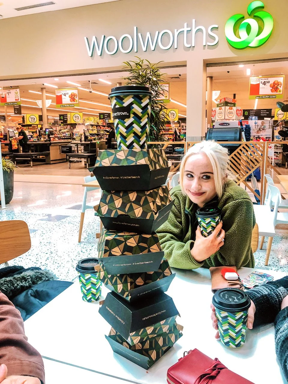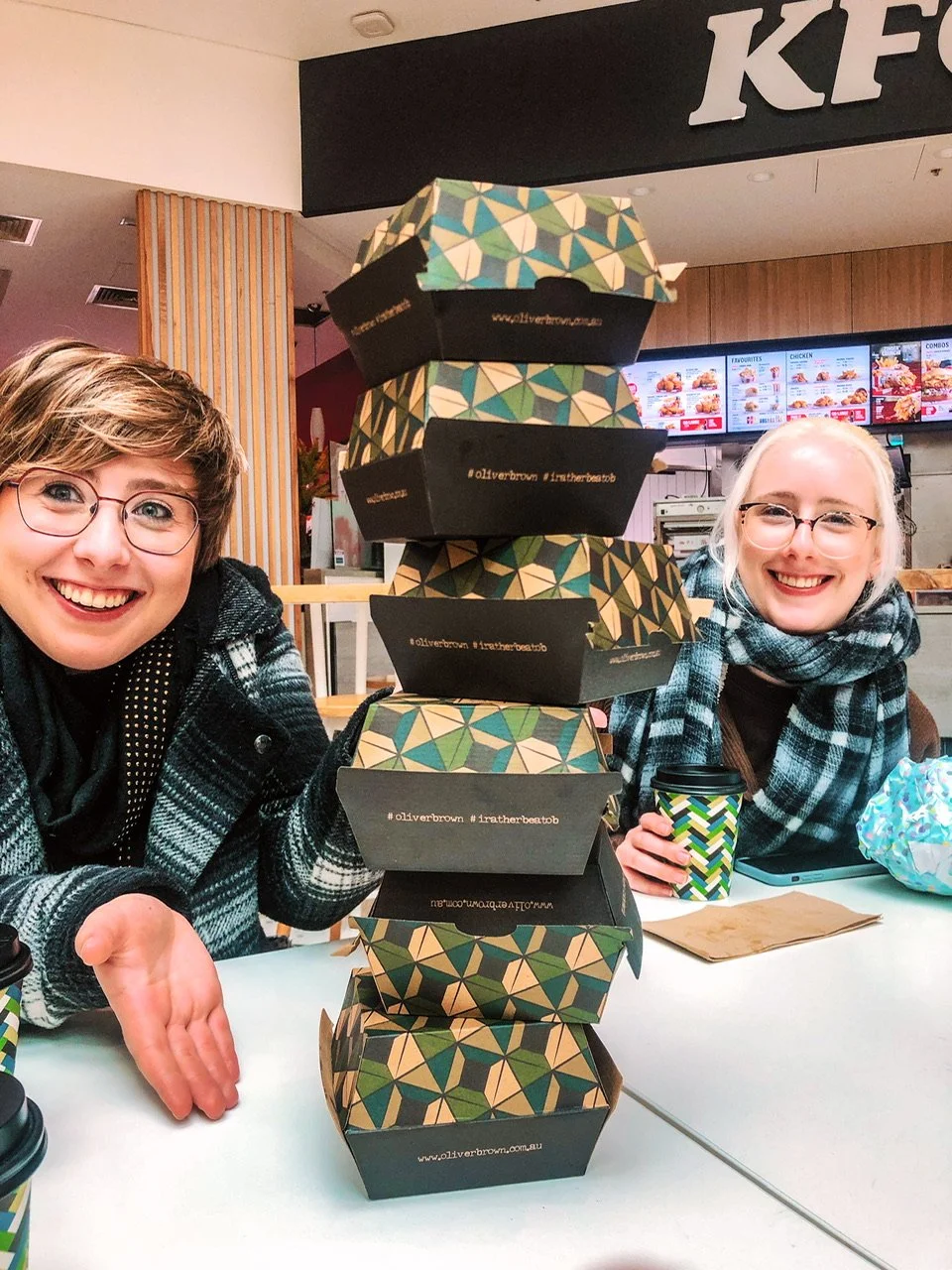 Eggs dripped, fingers were licked and coffee sipped. After the last mouthfuls of roll had disappeared, we built a wobbly tower of empty boxes and added a cup and even a wrapper.