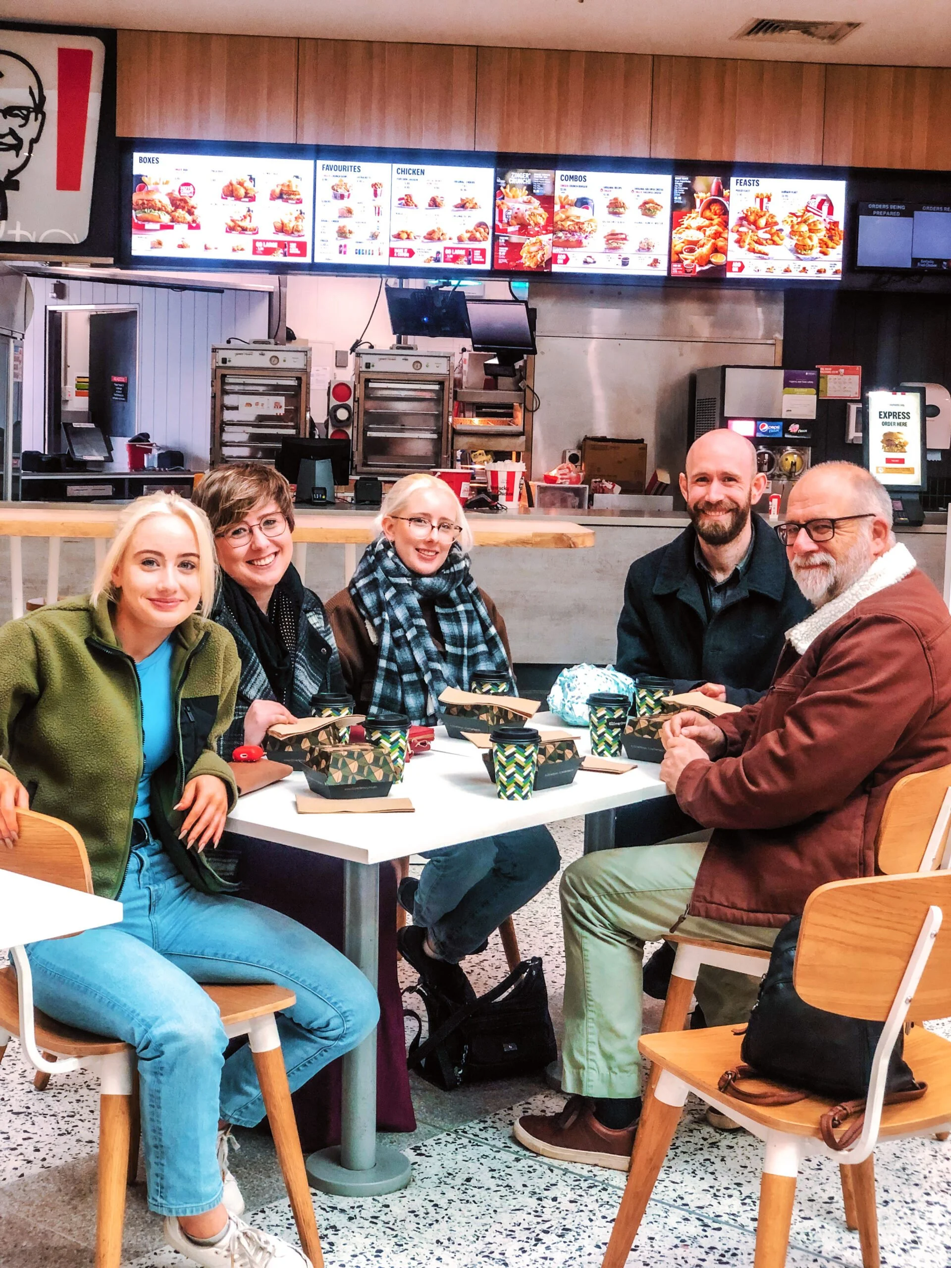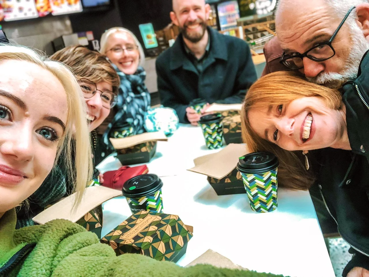We ordered egg and bacon rolls and coffee for six – Andy and I and four of our grown-up kids – then took our food to the empty food court – the morning was early – where we tucked into our Mother’s Day breakfast.