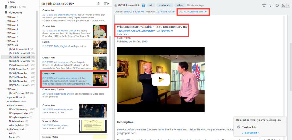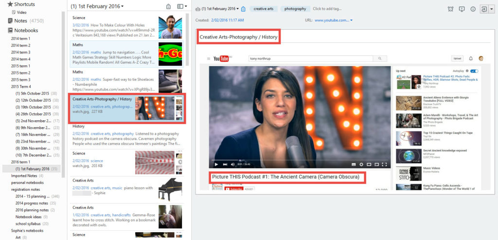My girls can share their own personal notebooks with me which helps with the record keeping. Sophie spends a lot of time researching photography online. She reads articles, watches Youtube videos, and recently she’s even started listening to podcasts. She has an Evernote notebook where she collects links to everything she has discovered. She keeps this notebook for her own interest, but I asked her if she’d share it with me for record keeping purposes. The notebook shows up in my side-bar amongst my own notebooks.